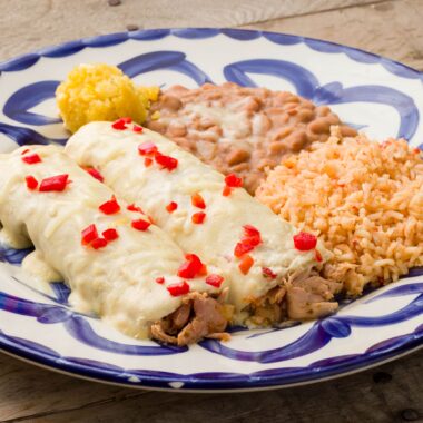 Tender chicken simmered and smothered in a savory sour cream sauce topped with jack cheese. Served with refried beans and rice.