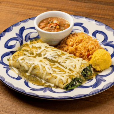 Sautéed fresh spinach, pasilla chiles, onions, Pico de Gallo, melted jack cheese and fire-roasted tomatillo sauce. Served with frijoles de la olla, rice and sweet corn cake.