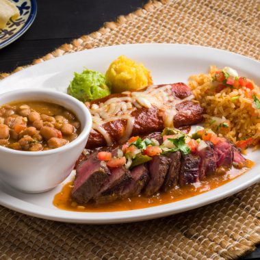 Skirt Steak topped with pico de gallo, with a cheese enchilada and tomato-jalapeño sauce. Served with rice, frijoles de la olla, fresh guacamole and warm tortillas.