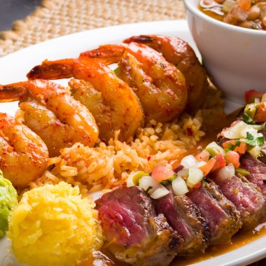 Skirt Steak topped with pico de gallo and sautéed shrimp. Served with frijoles de la olla, rice, fresh guacamole and warm tortillas.