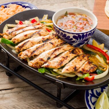 Grilled chicken breast fajitas, skirt steak fajitas and a cheese enchilada.