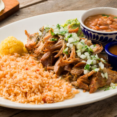 Slowly simmered in garlic, oranges and spices, our tender pork is served with guacamole, frijoles de la olla, rice and warm tortillas.